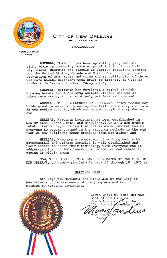 Whereas, Narconon Louisiana has been established in New Orleans, Baton Rouge, and Donaldsonville as a non-profit rehabilitation organization that has extended invitations to everyone to become trained in the Narconon methods to the end that we may eliminate these problems from our midst; and