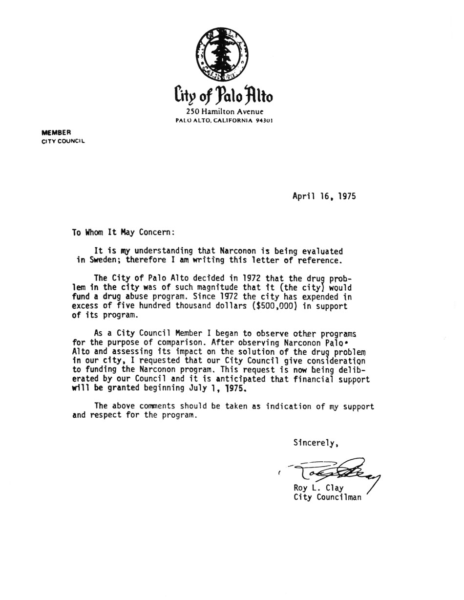As a City Council Member I began to observe other programs for the purpose of comparison. After observing Narconon Palo Alto and assessing its impact on the solution of the drug problem in our city, I requested that our City Council give consideration to funding the Narconon program. This request is now being deliberated by our Council and it is anticipated that financial support will be granted beginning July 1, 1975.