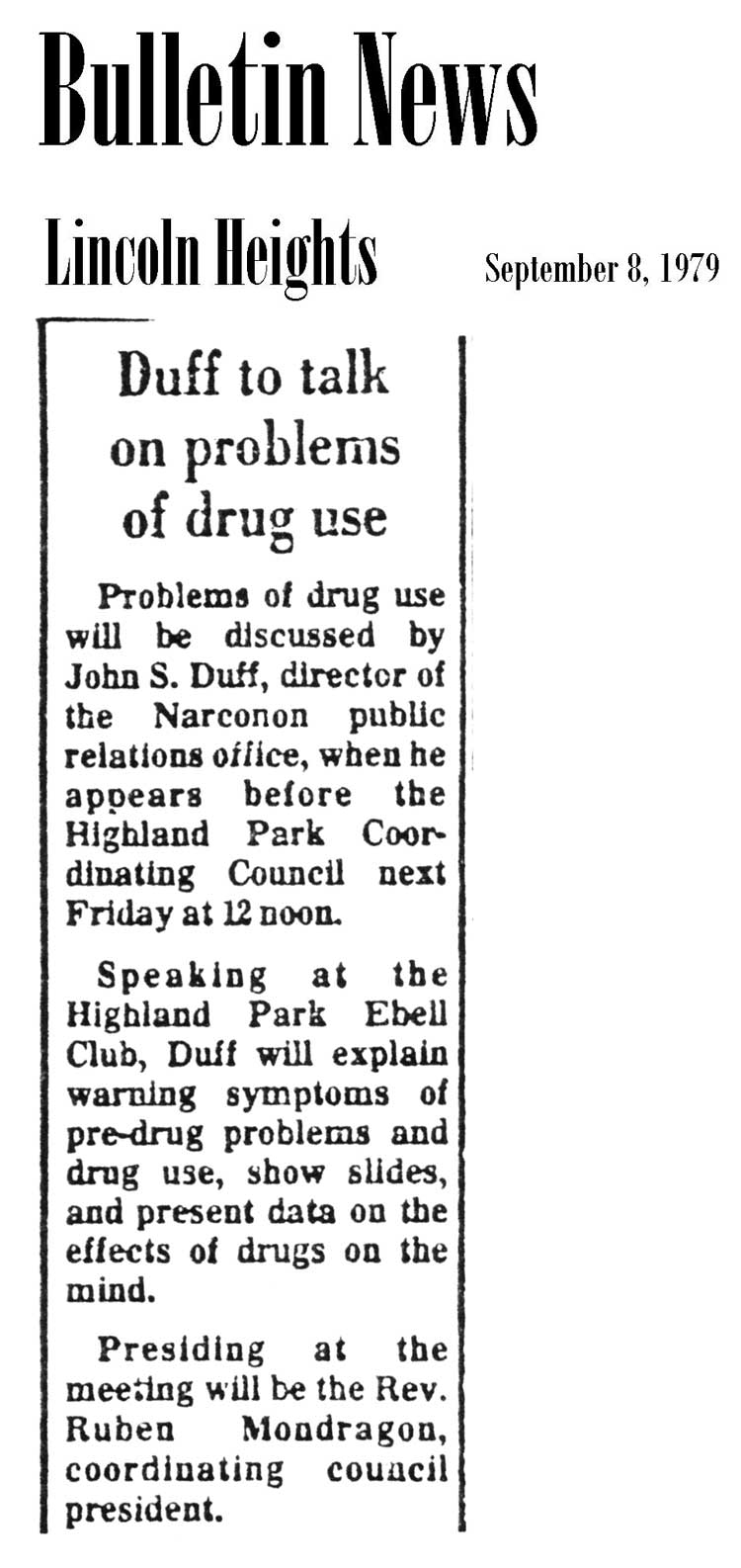 Problems of drug use will be discussed by John S. Duff, director of the Narconon public relations office, when he appears before the Highland Park Coordinating Council next Friday at 12 noon.