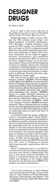 Designing drugs is really not new. During the 19th century many drugs were being designed. A German pharmacist, F.W. Serturner, isolated morphine from opium in 1803, cocaine was isolated from the coca bush in 1855 by a chemist named Edeleano. Since these and other early isolations and syntheses of drugs there have been thousands of new types of uppers, downers, tranquilizers, and painkillers designed and produced. What is meant by the term “designer drugs” as we are hearing it today? It has to do with the designing of drugs by slightly altering the chemical composition of existing illegal or controlled substances so that the effects are the same or close but the chemical formula or composition is different, therefore the laws regulating them no longer apply.