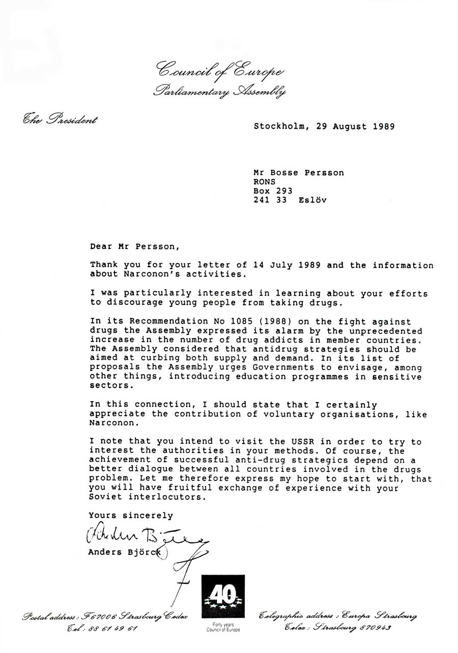 Thank you for your letter of 14 July 1989 and the information about Narconon’s activities.
